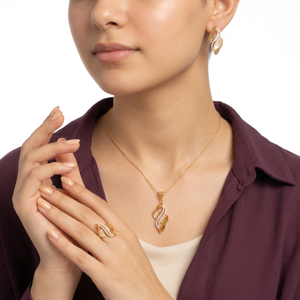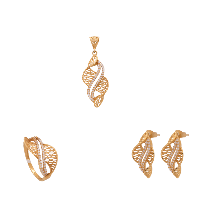 نصف طقم "أرث الملكة" عيار 21، مكون من 3 قطع بتصميم يجمع بين التراث واللمسة العصرية. مكون من تعليقة، أقراط وخاتم.