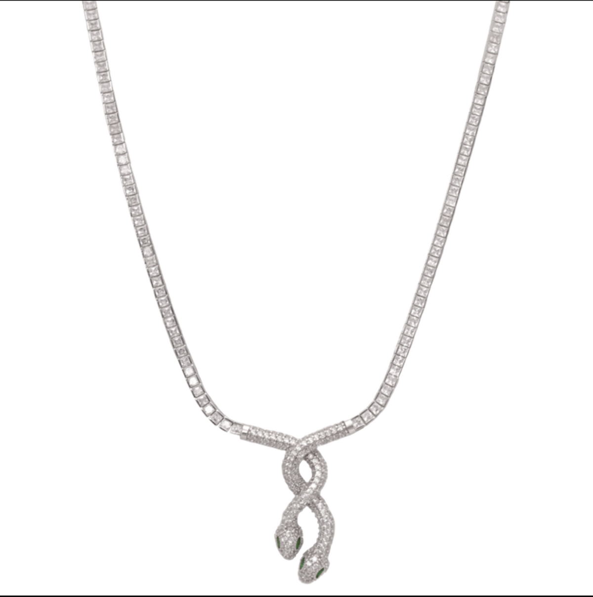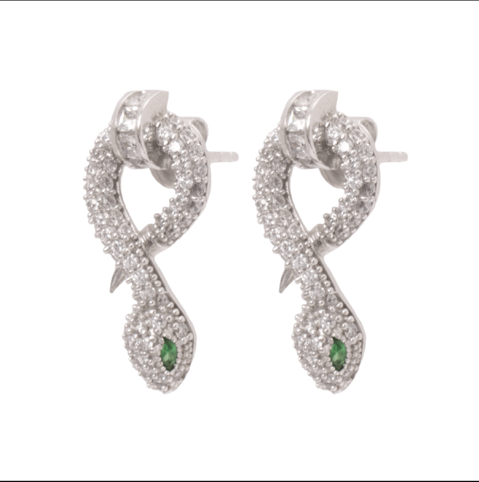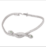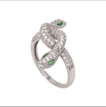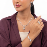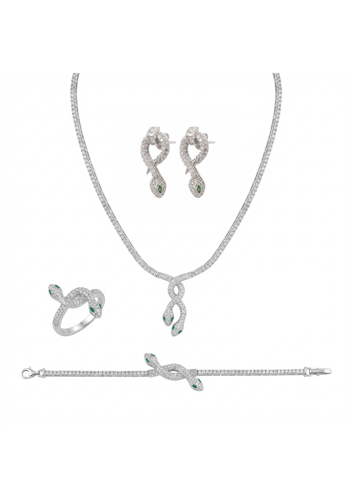 طقم ذهب عيار 18 مكون من 4 قطع أنيقة بتصميم يحمل رمز الثعبان، مكون من عقد، أقراط، خاتم وأسورة. كلا يأتي محمل بفصوص لامعة.