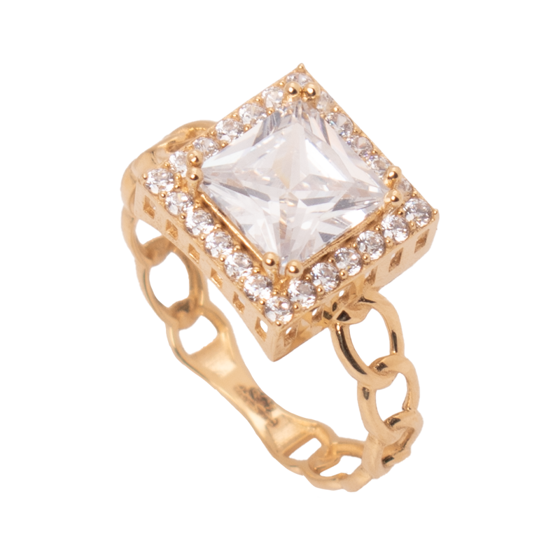 خاتم ذهب عيار 18 من غامية بسلسلة حلقات متصلة، يتوسطه حجر أصفر لامع محاط بإطار مرصع واضح، مع هيكل معدني متناسق يبرز شكل الحجر وثباته ويمنح الخاتم توازنًا بصريًا على الإصبع.