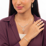طقم لوفد مصنوع من الذهب عيار 18، يتكون من عقد بتصميم قلب مع تعليقة متدلية برمز القلب مع خاتم، أقراط و أسورة كلا يأتي بفصوص لامعة.