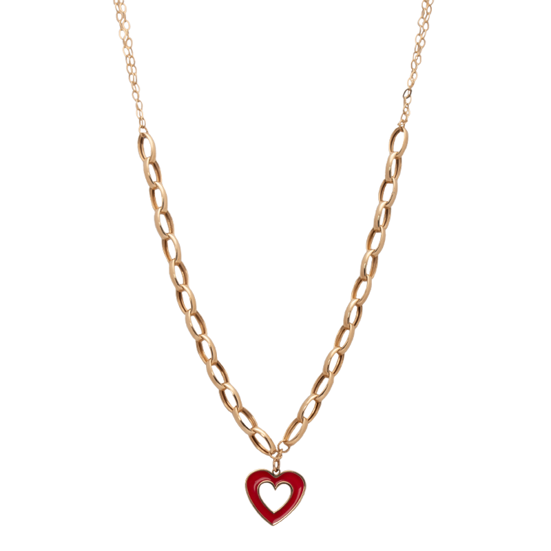 عقد ذهب عيار 18 بتصميم مميز يضم تعليقة قلب أحمر مجوف تضيف لمسة لافتة وجذابة. السلسلة العريضة تمنح القطعة حضورًا أنيقًا يناسب الإطلالات اليومية والمناسبات الخاصة.