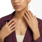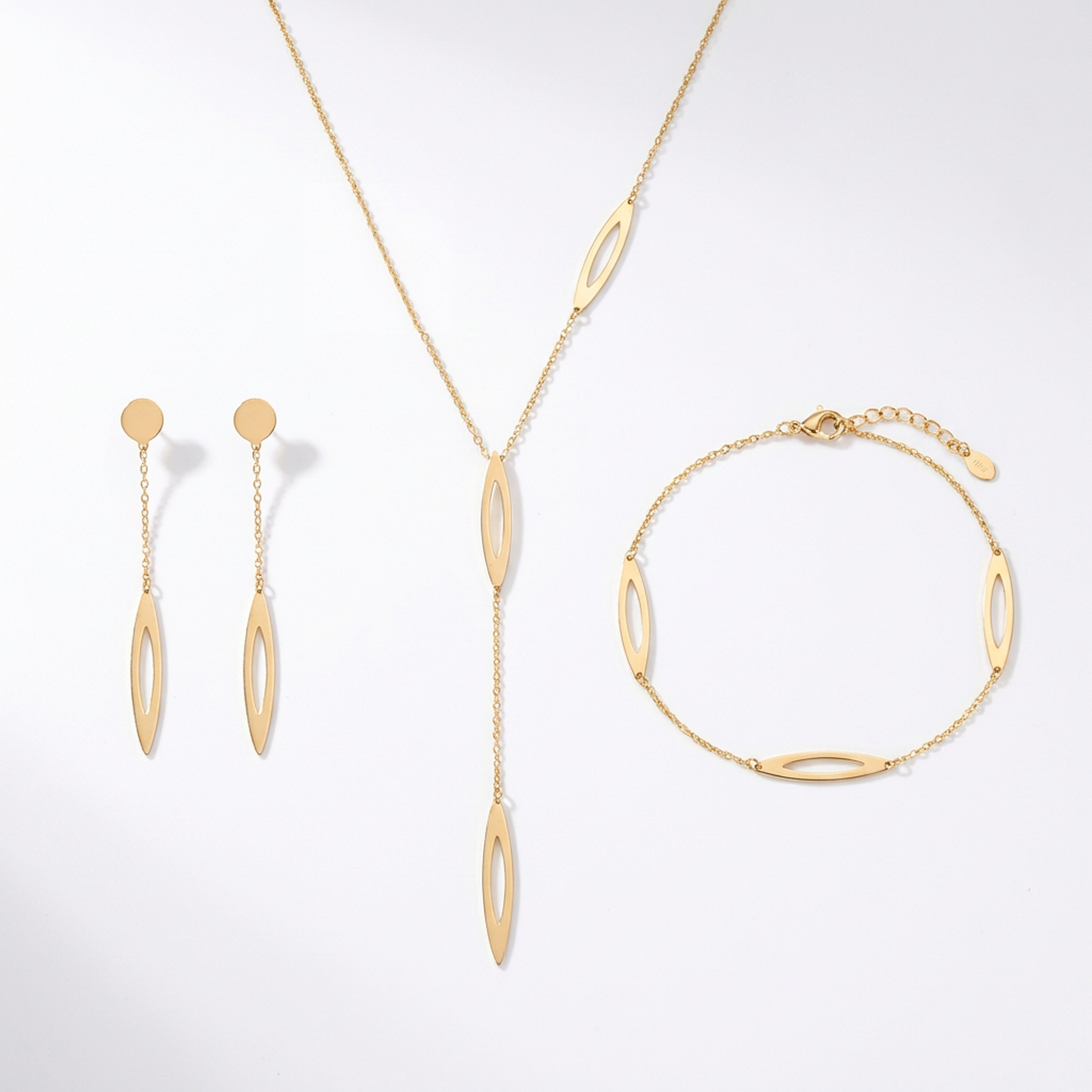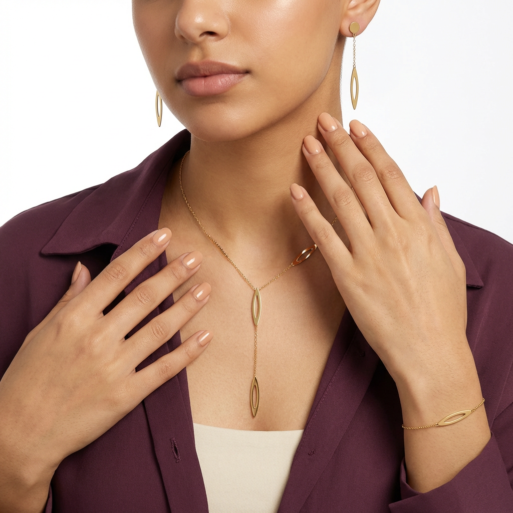 طقم كسوف مصنوع من الذهب عيار 18 بتصميم هندسي يجمع بين عناصر دائرية وروابط سلسلة متناسقة بتشطيب ناعم. يبرز التوازن بين الخطوط والأشكال الطابع العصري للقطعة، ما يجعلها مناسبة للمناسبات أو لإطلالة راقية تلفت الانتباه دون مبالغة.