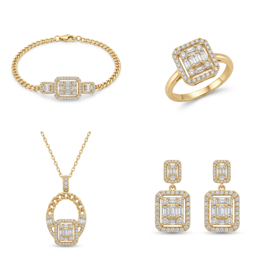 نصف طقم، مكون عقد، أقراط، أسورة وخاتم، بتصميم مربع مرصع بالفصوص اللامعة، يأتي لكي من الذهب عيار 18.
