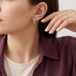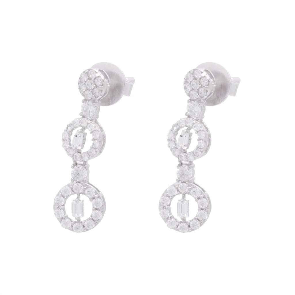 أقراط بتصميم متدلي طويل مرصع بالكامل من الفصوص اللامعة مع تصميم دوائر متدخلة بشكل أنيق مميز، مصنوع من العيار 18.