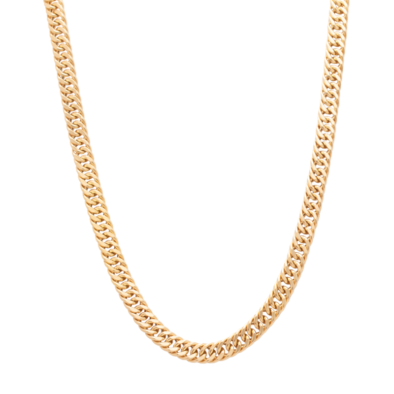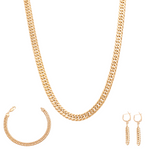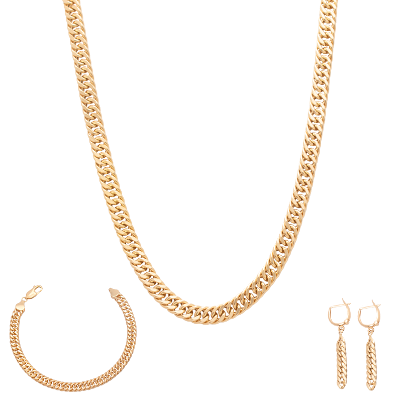 نصف طقم ذهب عيار 18 من غامية بتصميم موحّد يعتمد على حلقات ذهبية متشابكة بسطح مصقول، ويظهر بتناسق واضح في السمك والانحناء مع توزيع منتظم للعناصر يمنح القطع مظهرًا متوازنًا عند الارتداء.