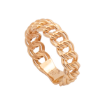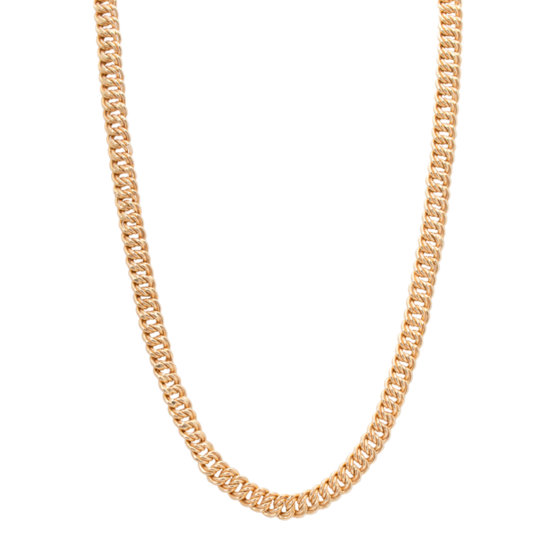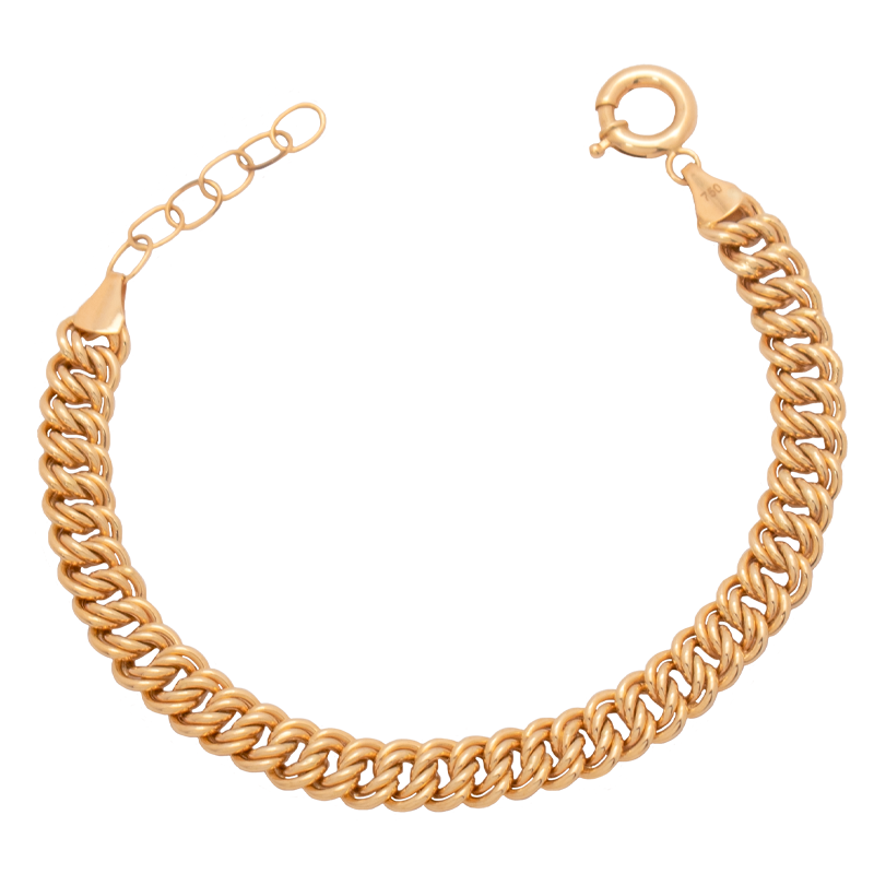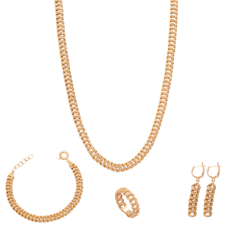 طقم ذهب عيار 18 من غامية بتصميم عريض يعتمد على سلسلة ذهبية بسطح مصقول ولمسة لامعة، ويظهر بتناسق واضح في السمك والانحناء مع مظهر متوازن يبرز قوة التصميم وانتظامه عند الارتداء.