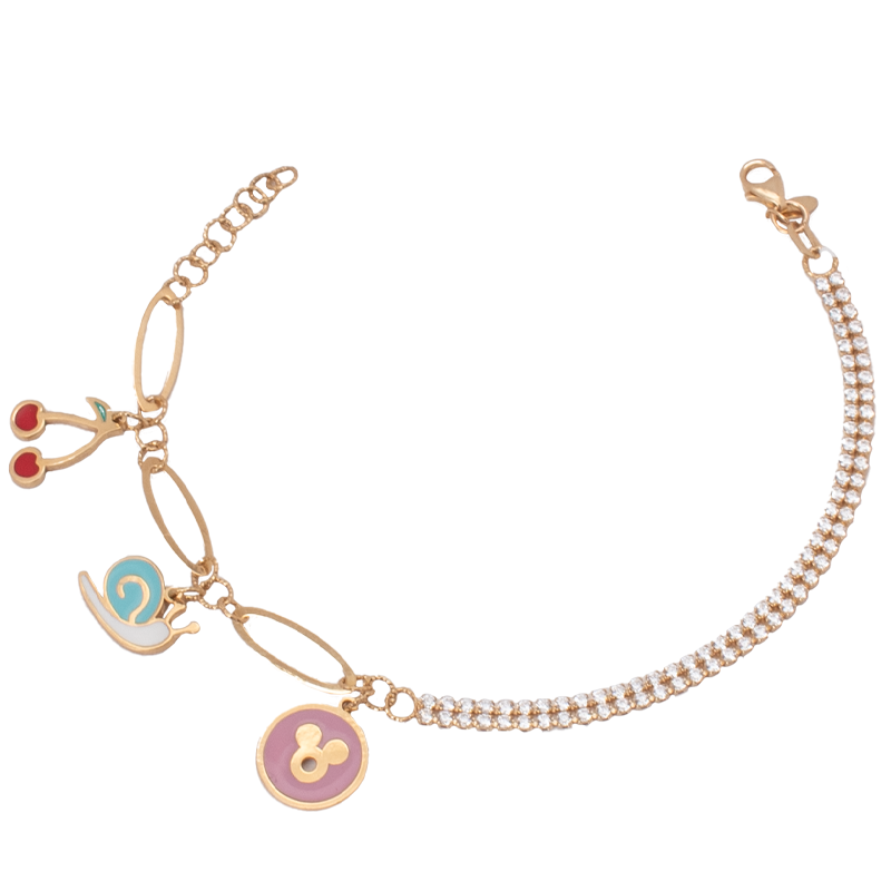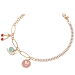 أنسيال ذهب عيار 18 بتصميم عصري يجمع بين جزء من السلسلة الرفيعة وجزء من الحلقات المتصلة، تتدلى منها تعليقات صغيرة ملوّنة تضيف لمسة مرحة وحيوية إلى إطلالتك اليومية، ويمكن تنسيقها بسهولة مع أسورة أخرى.