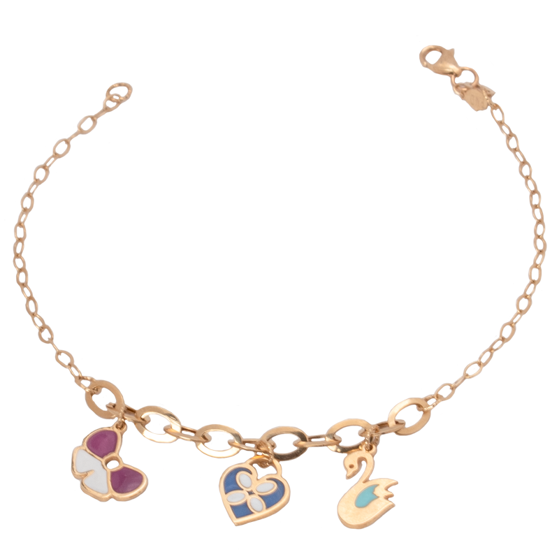 أنسيال ذهب عيار 18 بتصميم عصري مزود بتعليقات ملونة بأشكال قلب وفراشة وبجعة، مما يضفي جمالًا ومرحًا على الإطلالة. قطعة خفيفة وأنيقة تناسب مختلف المناسبات وتبرز جمال اليد.