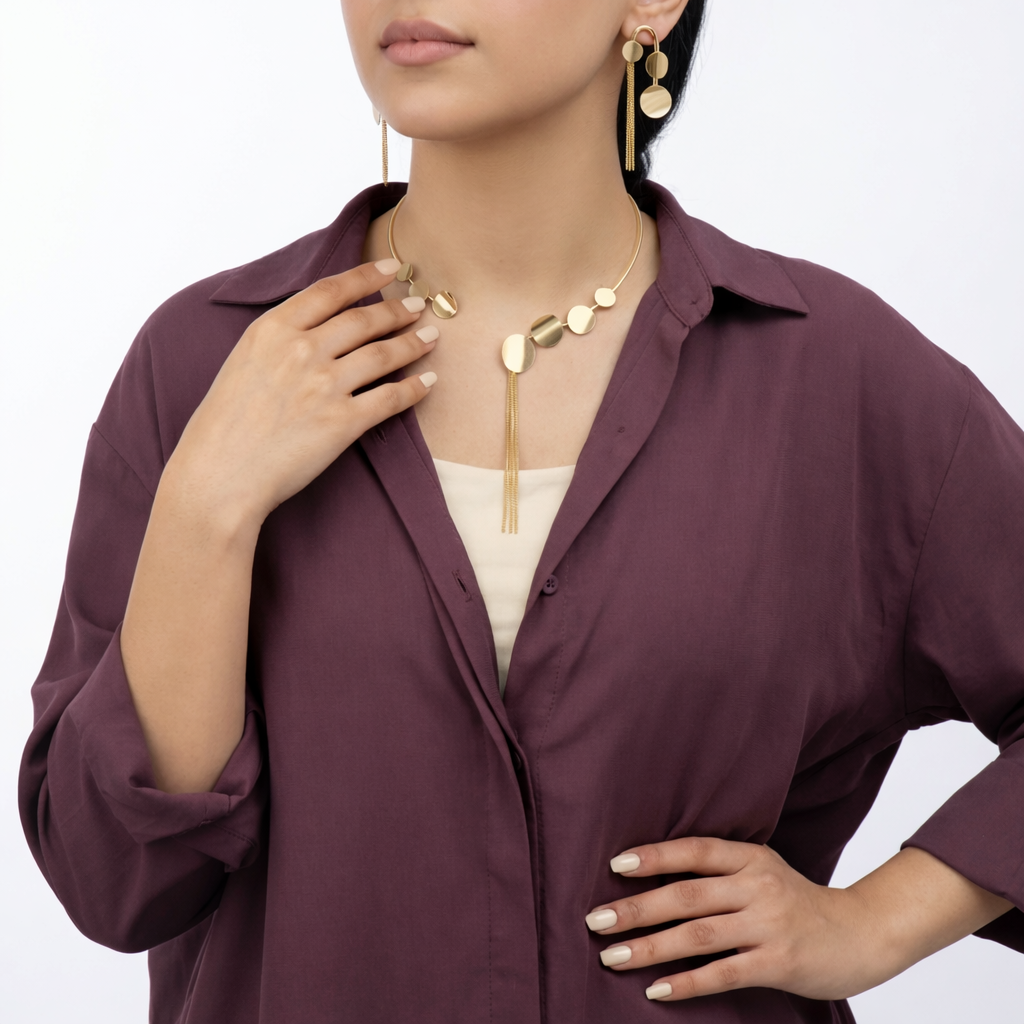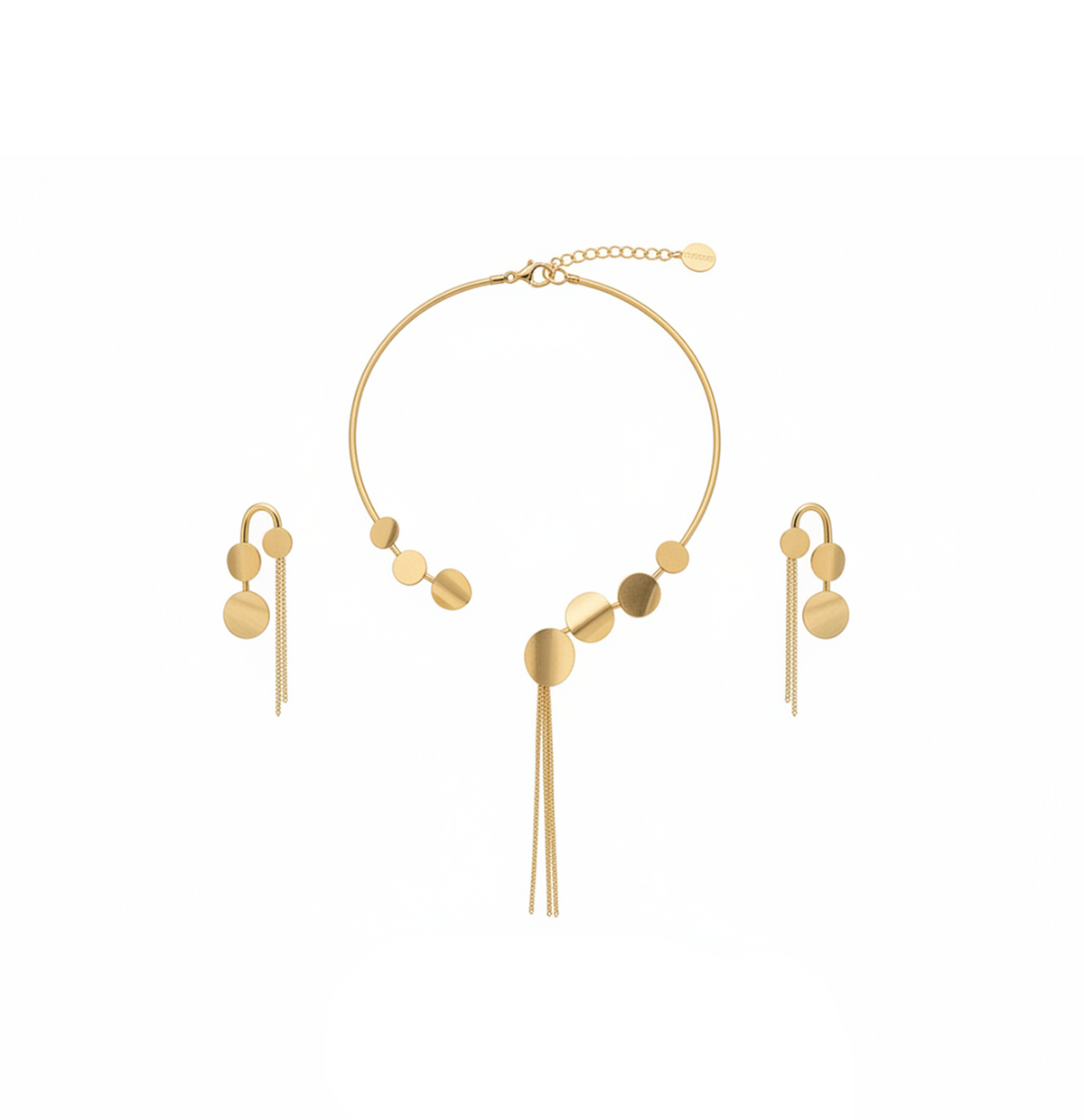 نصف طقم ذهب دوائر عيار 18 يتكوّن من عقد بإطار مفتوح تتوسطه دوائر ذهبية متدرجة الأحجام مع سلاسل ذهبية قصيرة متدلية، وأقراط أنيقة