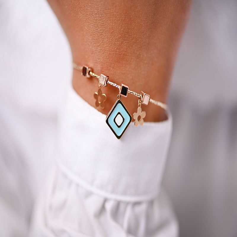 زيني يد أطفالك بأسورة رقيقة مثلهم، تجمع بين التصميم العصري مع لمسة من التميز، بفضل تصميمها بثلاث تعليقات، أثنين علي شكل زهرة ويتوسطهم تصميم هندسي بلون التركواز، كلا منهم مصنوع من الذهب عيار 18.