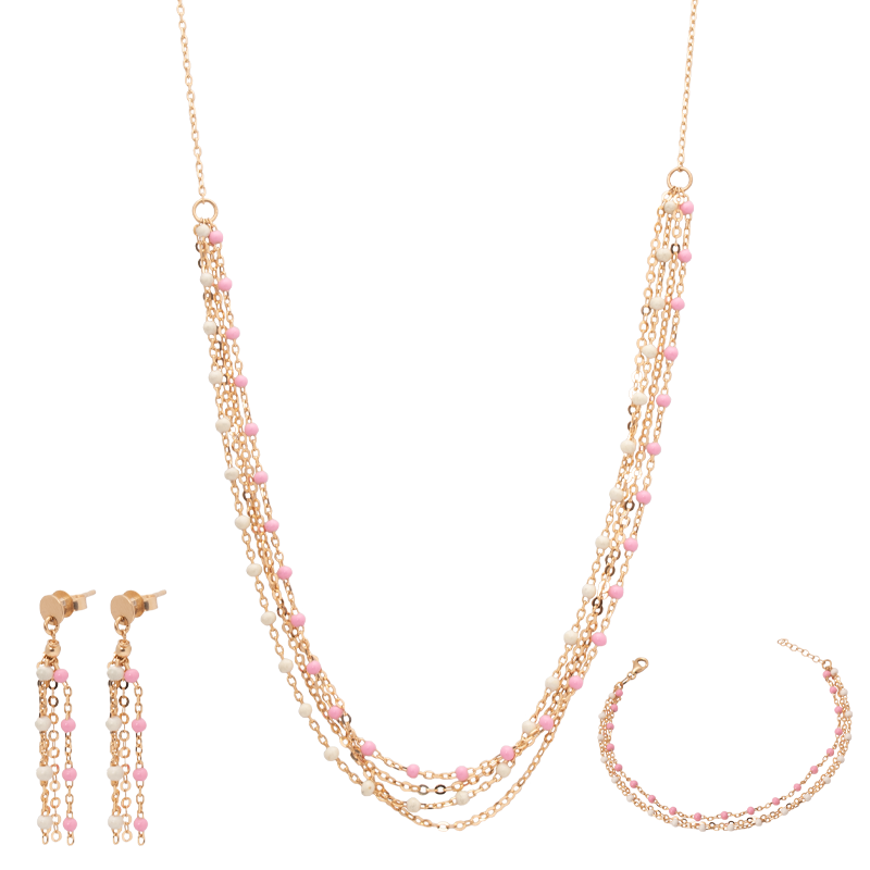 سعر الوحدة لكلنصف طقم ذهب راقي مصاغ من الذهب عيار 18، يتميز بتصميم متصل من الدوائر المزينة بفصوص وردية وبيضاء. هذه المجموعة مكونة من 3 قطع، عقد، أقراط وأسورة، كل قطعة منهم تمنحك حضوراً طاغياً وتبرز أناقتك، وهي مثالية لمن تبحث عن قطع مجوهرات تجمع بين الجمال والإبداع في الصياغة.