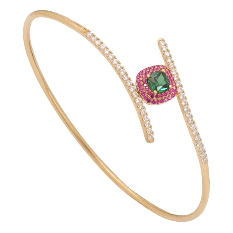 المعني الحقيقي للتميز ستشعرين به مع تلك الأسورة، المصنوعة من الذهب عيار 18 بتصميم مميز، يجمع بين الذهب وفصوص مرصعة بيضاء لامعة مع دائرة في المنتصف ملونه باللون البنفسجي والمرصعة بفصوص بيضاء لامعة مع حجر أخصر في منتصف الدائرة.