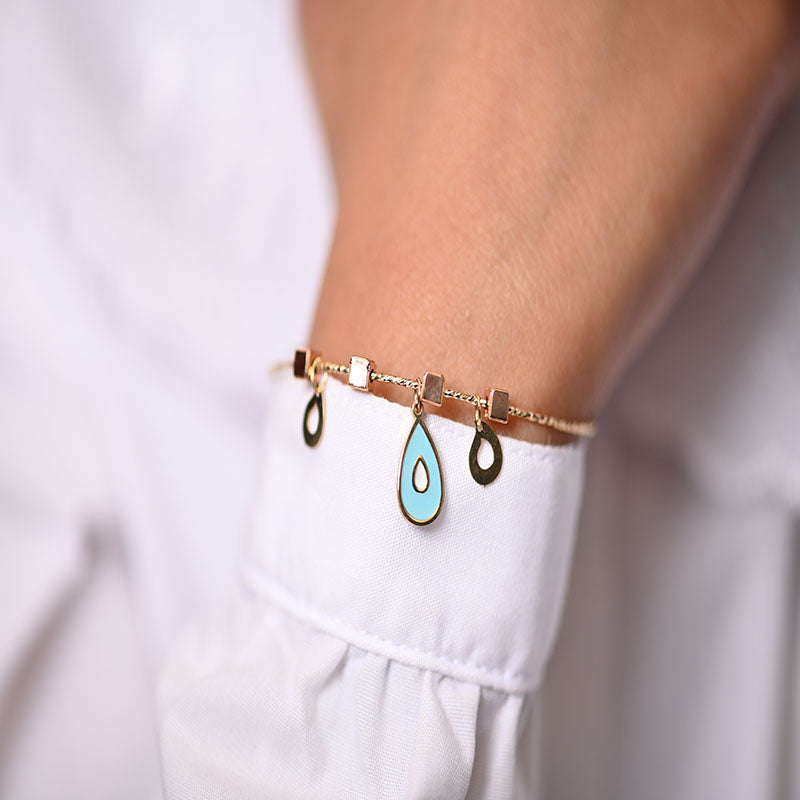 أسورة أنيقة وناعمة من الذهب عيار 18، يتميز بتعليقات على شكل دمعة متدلية. تتوسط التعليقات دمعة بارزة مطلية بالمينا الأزرق الفاتح والأبيض. تصميم هادئ وجذاب يضيف لمسة من اللون والرقة على معصمك، مثالي للإطلالات اليومية.